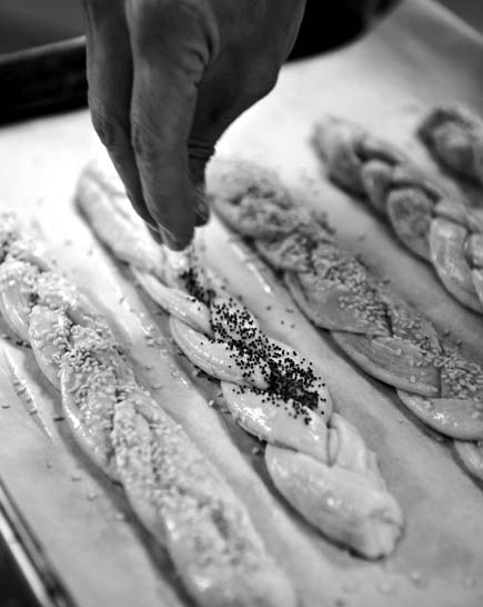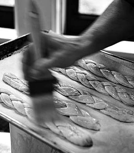 This is the big advantage over challah braided with “ropes” of dough. Those thick ropes requires 80 or 90 minutes or resting time after braiding; otherwise the result is dense. By keeping things very skinny, you can go straight to the oven after the braid is finished. Continue braiding…