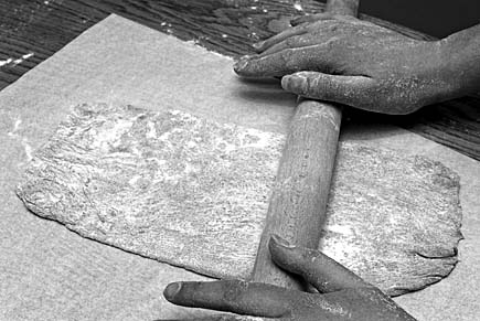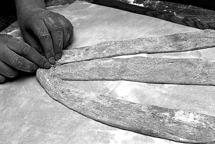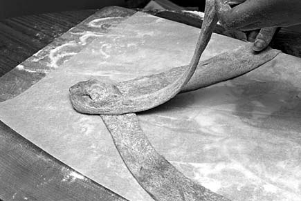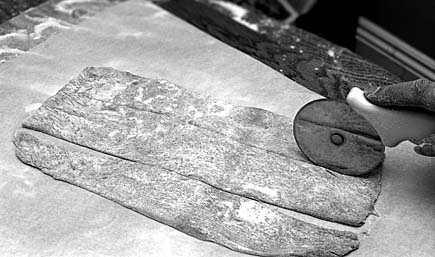 You can make bigger ones, but the half-pound size is easier to get thin. Now use a pizza wheel or a sharp knife to cut the rectangle into three long strips: