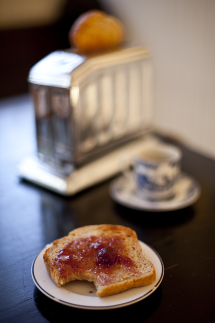 I admit my chrome toaster is more attitude, than practical, but pretty much any Toaster, Toaster Oven, Toastmaster Heavy-Duty Range broiler, Gas Grill, Butane Blow Torch or Branding Iron will get the job done. I like my toast very crunchy, so I put it on the longest setting. The internal temperature of the slice should reach about 211°F, as measured on a CDN DTQ450X ProAccurate Quick-Read Thermometer. Sometimes I’ll even push it down twice to get nice burnt bits, which I think contrasts well with Door County Sour Cherry Preserves (recipe page 213 Artisan Bread in Five Minutes a Day). I have an excellent toast recipe using a SousVide Supreme Sous Vide Water Oven, but it takes 6 hours, so I’ll save that post for another day.